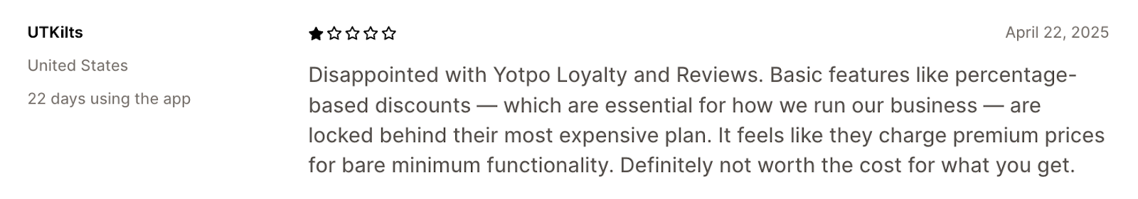 Merchants often complain about essential features like percentage-based discounts and VIP tiers locked behind the most expensive plans, while paying hundreds of dollars monthly for "bare minimum functionality."