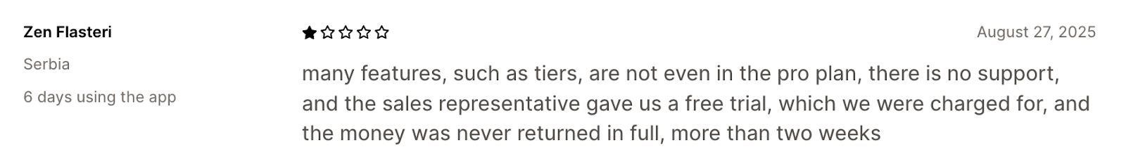 Yotpo frustrates merchants with essential features like VIP tiers and percentage discounts locked behind expensive plans, client success managers who never respond to messages, unreliable app performance, and billing issues where free trials get charged anyway and refunds take weeks.