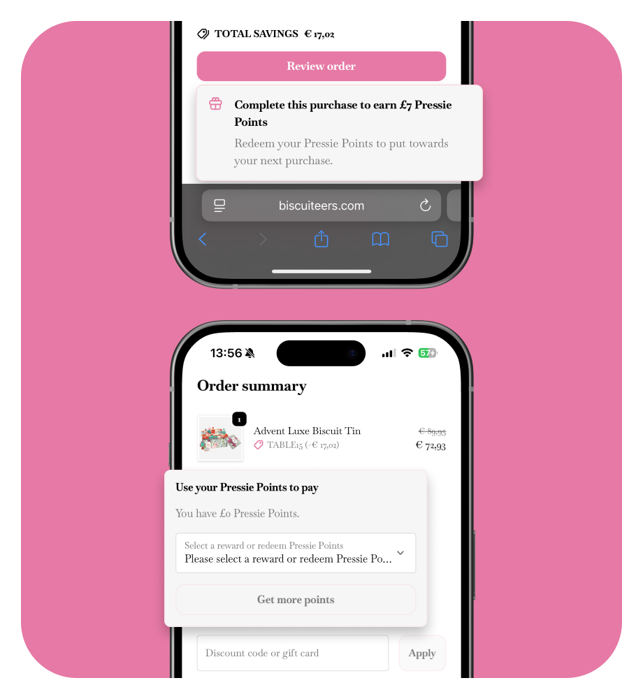 Beyond purchase-based earning, the team added a couple of high-intent actions that support repeat buying: customers can earn £5 worth of Pressie Points by adding three occasion reminders, and £5 worth of Pressie Points for leaving a review. To make the program truly omnichannel, Biscuiteers also introduced Pressie Points Club on Shopify POS in their London store, so customers can earn and redeem whether they shop online or in person.